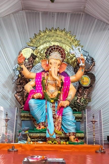The Ganesh Chalisa is a Hindu devotional hymn consisting of forty verses, each glorifying Lord Ganesha’s attributes and divine acts. Commonly found as a Ganesh Chalisa PDF for easy distribution and personal use, it’s written primarily in Awadhi dialect, making it accessible yet profoundly spiritual. The verses detail Ganesha’s physical appearance – his large ears, pot belly, and radiant complexion – alongside narratives of his birth and heroic deeds.